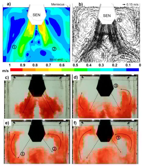 The comparison between physical and mathematical results was by video images of a tracer injection at different instants against velocity contours and velocity vector fields at the central symmetrical plane of the mold, as shown in Figure 3. The numerical results show an asymmetrical flow pattern inside the mold due to irregular entry jet behavior. These aspects can be observed primarily by the indicated differences in points 1 and 2 in Figure 3a,b, where it is clear that the jets' penetration is different. In contrast, the left jet penetrates deeply, and the right changes its tendency upwards before the mold end. This flow pattern induces asymmetrical upper roll flows, the left one being larger than the right one. This flow means that the right upper roll steel flow reaches the meniscus faster, arriving at the right port’s upper side before the left flow from the opposite upper roll flow (see point 3). After these observations, the physical modeling results are analyzed through the video images, see Figure 3c,f, where it is evident the qualitative agreement between both model results, allowing us to establish that the mathematical model is considered valid.