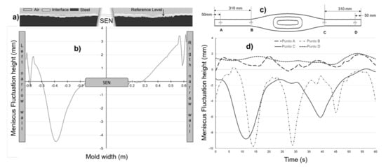 (a) Schematic view of the phases and meniscus position, (b) meniscus fluctuation during steady-state conditions, (c) schematic top view of the mold and (d) meniscus fluctuation during unsteady-state conditions.