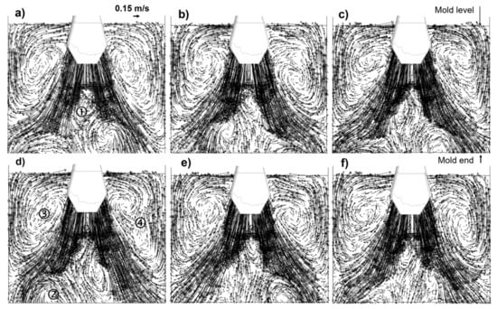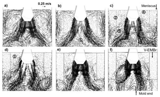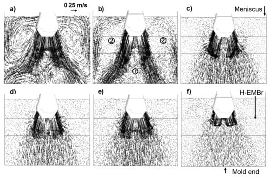 The analysis starts considering the horizontal EMBr position (H-EMBr) located below the SEN tip using five field intensities (0.1, 0.2, 0.3, 0.4 and 0.5 T); Figure 6 shows the effects on the fluid dynamics of the mold. It is essential to point out that each H-EMBr simulation used as a starting point the steady-state mentioned in Section 4.2, and subsequently, the simulation using the EMBr ran for another 300 seconds. Figure 6a shows the flow patterns without EMBr, and they are employed as a reference point to contrast the effects of the different EMBr intensities on the fluid flow. Figure 6b,f show the results at the second 540 of the total simulation for each case. Figure 6b shows the results of applying an electromagnetic field of 0.1 T; this H-EMBr magnitude immediately brakes the turbulence intensity, observed by the reduction in the bulk flow velocity. Besides this, the sizes and velocities of the lower recirculations are markedly reduced (Figure 6b—point 1), allowing deeper penetration of the entry jets. This condition induces longer upper roll flows with smaller velocities (Figure 6b—point 2) due to the second brake that suffers the steel flow moving upwards near the narrow mold faces, which are the ones which feed these rotating flows. Despite this slowing down of the whole flow velocity, the flow asymmetry remains since the ascending stream close to the narrow face, at the left mold side, moves faster than the one at the right mold side. Figure 6c shows the effects of a 0.2 T field intensity on the fluid flow, where it is evident that the DD phenomenon has been eliminated. The cascade effect of the lower recirculations is eradicated together with the upper roll flows. Due to this result, the flow leaving the H-EMBr section moves downwards, in a single stream with an apparent plug flow pattern. The implementation of higher field intensities provides almost the same flow patterns but just decreasing in velocity intensity (Figure 6f).