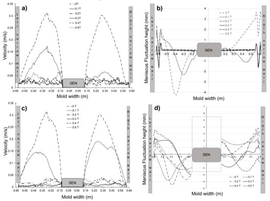 The meniscus velocity and its fluctuations were calculated throughout the broad face of the mold, considering only the central axis. Figure 8 shows the results of these two variables for both types of EMBr. This figure shows that the meniscus velocity is reduced by around 50% using just a field intensity of 0.1 T and even more than 80% for higher field intensities; these results are regardless of the EMBr type.