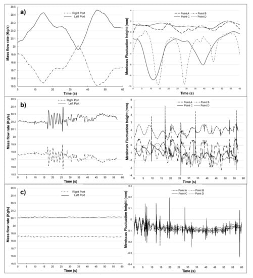 The analysis of the above observations was at the same instant for all cases. However, Figure 4 demonstrates that the intensity of meniscus fluctuations strongly depends on the DD occurrence and that the full effects of such a phenomenon only can be observed studying the simulation results over a period. Hence, to analyze how both EMBr types counteract the DD effects, two variables were monitored for 60 seconds. The first is the mass flow rates delivered by each SEN port, and the second is the height of the meniscus fluctuation at the same four positions employed, indicated in Figure 4c. These two variables, when EMBr is not applied, are shown in Figure 9a. In this case, the DD phenomenon was detected twice by marked differences between the mass flow rates delivered for each port of the SEN. Its occurrences were at seconds 15 and 45 approximately. Here, regarding the mass flow, there is a difference of around 1 kg/s when the DD is occurring, and it is smaller in the oppositive case, around 0.2 kg/s or even less. The consequence of the DD phenomenon is that the meniscus presents strong fluctuations where the funnel shape begins. It is notorious that the fluctuations in the meniscus are not occurring precisely at the same moment when the mass flow rate variations arise. There is a lag-time because the flow requires time to travel throughout the mold interior until reaching the meniscus, making the uneven mass flow rate not have an instantaneous effect on the meniscus stability. Despite this time discrepancy between these two flow signals, these figures demonstrate clearly that the intensity of the meniscus fluctuations depends on the DD phenomenon occurrence and intensity.