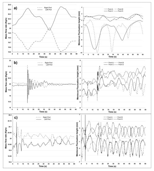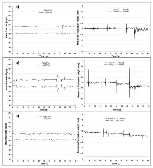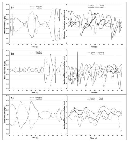 Mass flow rate in the SEN ports and meniscus fluctuation height during 60 seconds at unsteady-state conditions, V-EMBr, (a) 0, (b) 0.1 and (c) 0.2 T.