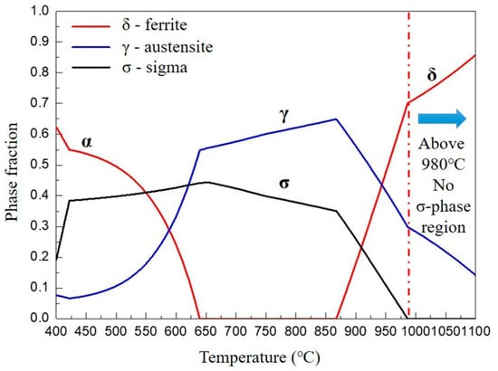 Duplex stainless steel (DSS) is a two-phase stainless steel comprising equal volumes of the δ phase and γ phase. The austenite ensures good ductility, toughness, and weldability. The ferrite raises the corrosion resistance mainly against pitting, stress, and crevice corrosion. It has high strength and superior corrosion resistance due to the presence of alloying chromium (Cr), molybdenum (Mo) and nickel (Ni). SAF 2507 (S32750) is developed mainly for chloride-containing environments, like seawater. Therefore, it contains higher amounts of Cr, Mo and N, which also improve the microstructural stability [1,2,3]. The high Cr alloying can increase the corrosion resistance and the Ni improves the toughness. The N can increase the strength and resistance against pitting corrosion [3]. The optimization of the corrosion resistance and the mechanical properties of DSS rely on the precise control of the microstructural evolution during hot deformation and the subsequent process of solid solution [4]. The thermal expansion coefficients between the austenite phase and ferrite phase are different and prominent in DSS. A remarkable thermal stress can be generated, resulting from variations in temperature [5,6] during thermal cycling. On the other hand, an appropriate treatment is required to avoid the existence of undesirable intermetallic phases (such as σ and χ) [4]. The sigma phase among the intermetallic precipitates is the most detrimental, because it can cause considerable drops in corrosion resistance and toughness [7].