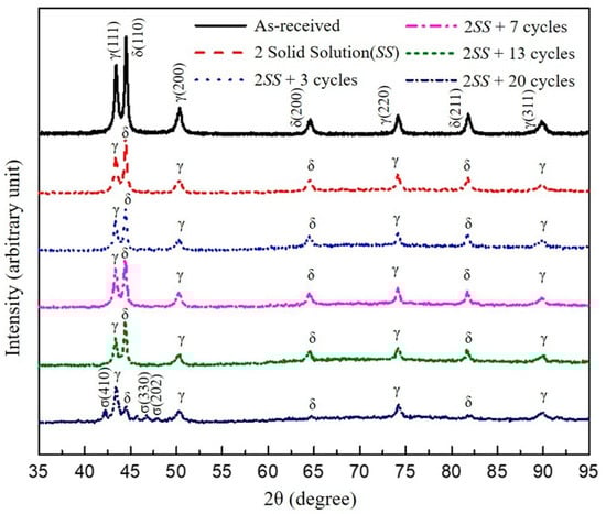 The correlation between the phase fraction and temperature in DSS are exhibited in Figure 2, which was calculated by Thermo-Calc. As shown in that figure, only two phases, δ and γ, coexisted above 980 °C, and there was no intermediate σ phase. Therefore, a high temperature of 1100 °C was chosen as the temperature of the SS treatment and the peak temperature (Tmax) of thermal cycling to achieve the study goal of the largest ΔT in the cyclic thermal process. To verify the evolution of the crystalline constituent after the cyclic thermal process, the results of the XRD are plotted in Figure 3. The only ferrite and austenite were observed in the as-received, 2SS, 2SS + 3 cycles, 2SS + 7 cycles, and 2SS + 13 cycles specimens. Moreover, the δ phase XRD peak intensity decreased and the σ phase peak intensity appeared only at 2SS + 20 cycles (Figure 3).