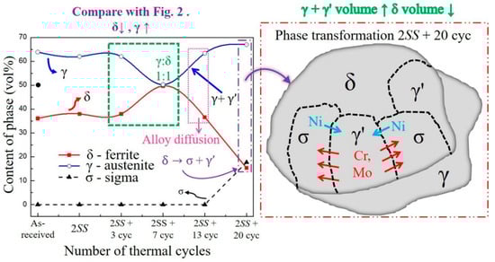 The volume changes of the various phases are shown in Figure 4 as a function of thermal cycles. It was found that the γ volume decreased and the δ volume increased from 2SS + 3 cycles to 2SS + 7 cycles, consistently with the thermodynamic prediction in the temperature range of 850 °C to 1000 °C in Figure 2, to achieve the ideal equilibrium ratio of δ:γ = 1:1 at 2SS + 7 cycles, as depicted in the green square in Figure 4. After the intersection point at 2SS + 7 cycles in Figure 4, the γ phase volume inversely increased and the δ volume decreased with increasing numbers of cycles (2SS + 13 cycles and 2SS + 20 cycles), causing the formation of small γ’ grains, indicated by the fine dotted pink rectangle and purple rectangle in Figure 4, based on the δ phase eutectoid decomposition of δ → σ + γ’ [5,27]. This so-called secondary γ’ with high nickel and low chromium content is generated from the eutectoid decomposition of δ. The total γ volume increase resulted from the eutectoid γ′ merging into the original γ phase grain, as indicated by the fine dotted pink narrow rectangle in Figure 4.