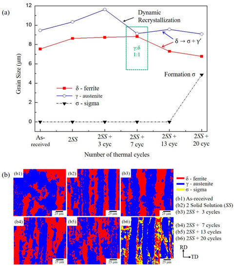 In addition, the grain sizes of the δ and γ phases were influenced by the cycles, as shown in Figure 5a. The grain sizes of γ and δ initially increased due to grain growth. After that, the γ grain size decreased from 2SS + 3 cycles to 2SS + 7 cycles due to the dynamic recrystallization of the γ phase (Figure 5). During thermal cycling, heterogeneous stresses and strains that developed between the δ phase and γ phase favored recrystallization over grain growth, thus leading to grain refinement [18,28]. The eutectoid decomposition of the δ phase resulted in the γ grain size increasing slightly due to the merged γ’ and the δ grain size shrinkage at 2SS + 13 cycles and 2SS + 20 cycles, as depicted in Figure 5a.