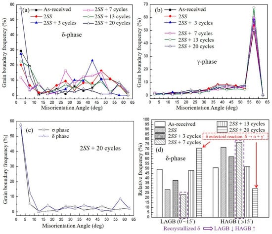 A low angle grain boundary (LAGB) is assigned as the definition of misorientation, θ < 15°. During plastic deformation, the free dislocations generated can readily rearrange themselves and lead to the development of LAGB for quite a lot of grains [25] in Figure 6a. However, θ > 15° is termed a HAGB (high angle grain boundary). A misoriented angle distribution was observed in all grains after different numbers of thermal cycles, as summarized in Figure 6a–d. The grain boundary angle changed with the thermal cyclic number. Particularly, the grain boundary angles of most γ grains were concentrated between 53° and 63°; they were not affected by the thermal cyclic number (Figure 6b). It has been reported that newly reverted γ assembles the lath martensite at high-angle boundaries after repeated thermal cycles [20,24]. The complexity increases because of the simultaneous presence of δ and γ phases in DSS. Some reports have indicated that the ferrite phase of DSS exhibits dynamic recovery (DRV) at high temperatures, and the austenite phase of DSS dynamic recrystallization (DRX) [29,30]. Because γ has a lower yield stress than δ in DSS, thermal stress-induced plastic deformation occurred earlier at the γ grains. Thus, most HAGBs higher than 50° triggered DRX in the γ grains, including annealing twins after annealing, and led to a buildup of higher misorientation between neighboring sub-grains [31,32,33] in Figure 6b. In contrast, all the misorientation angles of the δ phase exhibited a random wide distribution from 2° to 63° for all the different thermal cycling parameters, such as as-received, 2SS, 2SS + 3 cycles, 2SS + 7 cycles, 2SS + 13 cycles, and 2SS + 20 cycles in Figure 6a,d. It was noted that the misorientation angle distributions of the δ and σ grains were very similar, as depicted in Figure 6c. This plausibly confirmed that the σ grains originated from δ grains in situ by eutectoid decomposition in the 2SS + 20 cycles condition. Intrinsically, the bcc δ phase had high stacking fault energy (SFE), and the fcc γ phase had low SFE [25,34]. The δ ferrite showed DRV, with high stacking fault energy, by the rearrangement of accumulating lattice dislocations through slip systems to form the substructures and subgrains. The γ austenite, with lower stacking fault energy, showed DRX to generate some HAGB and twin boundaries at around 57.5° [31,34], as shown in Figure 6b. Recrystallization caused most grains with misoriented HAGB to be driven by the thermal cycling induced thermal stress assisted thermodynamic equilibrium, as shown in Figure 4 and Figure 6d (dotted vertical rectangle) at 2SS + 7 cycles. Consequently, the number of HAGB grains increased and the δ:γ ratio was the ideal 1:1, in contrast to the unchanged misoriented angles of γ grains in Figure 6b. It is noted that the misorientation angle distributions do not account for boundaries with misorientations below 2° because of the intrinsic limitations of the EBSD technique [35].