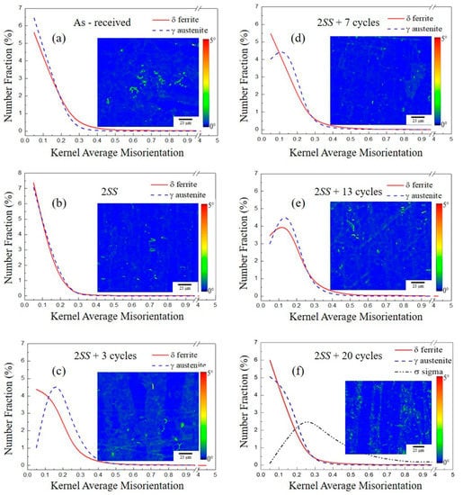 The KAM mapping and the distribution of number fractions versus KAM below 5° represented local plastic strain in green in mapping under the thermal cycling condition. A solid red line indicated the δ grains with lower local misorientation (less plastic strain), comparing with a dotted blue line indicated the γ grains with higher local misorientation, both at different thermal cycles, as depicted in the line plot of Figure 7. The δ and γ KAM curves were coincident after two solid solution cycles (Figure 7b) and better than that of the as-received material (Figure 7a). Compared with the low local strain in the as-received and solid solution treated samples, the KAM of the δ and γ grains had a tendency for high local strain caused by thermal cycling, as shown in Figure 7c–f. The blue dotted line shape of the γ KAM curves varied significantly more than the red solid line shape of the δ KAM curves after thermal cycling because DRX occurred in the γ phase in Figure 7c,d. The same trend of both the red-line shape for δ and the blue dotted line shape for γ plausibly resulted from the initiation and nucleation of δ eutectoid decomposition at 2SS + 13 cycles in Figure 7e. In the 2SS + 20 cycles condition, the σ formation induced a higher KAM strain at the σ grain boundary than at the δ and γ grain boundaries, as shown in Figure 7f. The blue mapping inset in Figure 7 represents the grain region adjacent to the boundary with a very low dislocation density [29]. Generally, the high dislocation density results in a subgrain angle > 1° [40,41,42,43] which can lead to the deformed grains having KAM > 1°, whereas the recrystallized grains have KAM < 1°. The newly formed grains during recrystallization revealed a random texture. The local dislocation density distribution and the recrystallization fraction [44,45] might be examined from KAM results. In the DSS, the misorientations (>15°) among grains also dominated the location of σ formation. The σ precipitation sites were favored at high crystallographic misorientation sites between the γ/δ and δ/δ boundaries. Meanwhile, the amount of σ content increased and the minimum critical deviation angle for σ phase formation was reduced [46] as the annealing time increased.