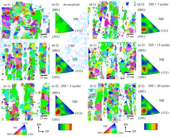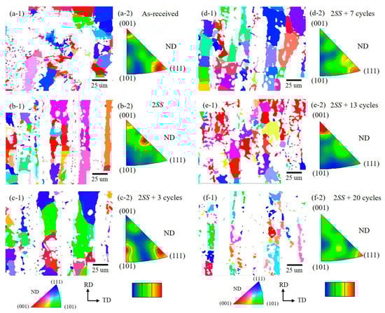 The inverse pole figure (IPF) obtained by EBSD exhibited the most frequent grain orientation analysis on normal direction (ND) planes, as shown in Figure 8 and Figure 9 for different thermal cycles. The δ phase grain orientation changed in the order shown in Figure 8(a-1–f-2) as follows. The most frequent δ orientations of most grains in the as-received material were <001> and <111>, which changed to close to <113> and <001> orientation and <111> disappeared at 2SS. The most frequent orientations transferred to <101> and <111> at 2SS + 3 cycles, then to the most frequent orientation <111> with a few grains at <112> at 2SS + 7 cycles and the most frequent orientation was <001> at 2SS + 13 cycles. Consequently, most grains had random orientation, with few grains of the most frequent <111> at 2SS + 20 cycles. This can plausibly be explained by either recrystallization of δ or the new σ grain formation by the eutectoid reaction at 2SS + 20 cycles.