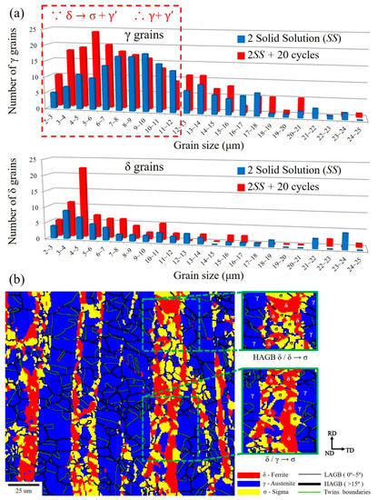 The grain sizes of variously-oriented γ and δ grains are plotted at the top of Figure 10 for 2SS (blue bar) and 2SS + 20 cycles (red bar). The γ phase map in blue at 2SS + 20 cycles revealed numerous twins (twin boundaries depicted with green lines in Figure 10b embedded among the large γ grains, some of which attracted small γ’ grains. No twins were found inside the δ and σ grains in Figure 10b. It was found that the γ and δ grain sizes were both refined significantly by the large ΔT thermal cycling process, as shown in Figure 10a.