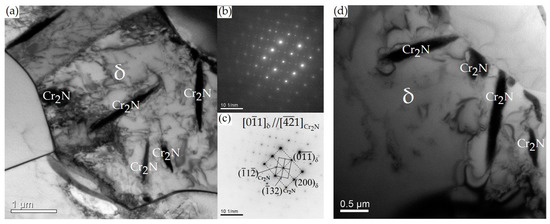 Microstructure of a specimen aged at 600 °C for 7 h (a) transmission electron micrograph showing Cr2N precipitated within δ-ferrite; (b) diffraction pattern with zone ; (c) interpretation of (b); (d) Cr2N formed at phase boundary.