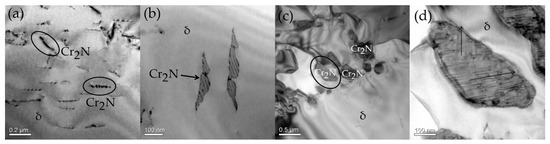 (a) TEM micrograph of a specimen aged at 600 °C for 7 h, and (b) high magnification of (a); (c) TEM micrograph of a specimen aged at 750 °C for 5 h, and (d) high magnification of (c), showing the many fringes in Cr2N.