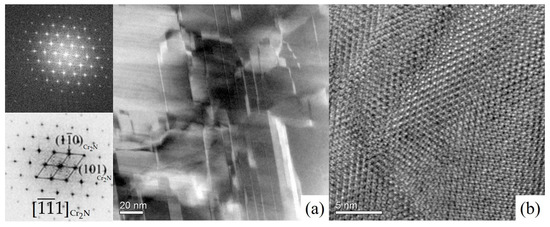 Figure 2a is a micrograph of Cr2N precipitated at 600 °C after 7 h holding, and Figure 2b presents a high magnification image of Figure 2a. Figure 2c is the micrograph of Cr2N precipitated at 750 °C after 5 h holding, and Figure 2d presents a high magnification image of Figure 2c. What is interesting is that Cr2N in the high magnification images has many fringes in it (Figure 2b), and even two fringe directions can be observed (Figure 2d). The substructure within Cr2N is visible. Furthermore, the further high magnification of Cr2N precipitated at 750 °C after 5 h of holding shows that Cr2N is not as simple as we have seen. The fact is that Cr2N is composed of many different domains (Figure 3a), which are further separated into different regions, as illustrated by the HRTEM or HREM (High-resolution transmission electron microscopy) image (Figure 3b).