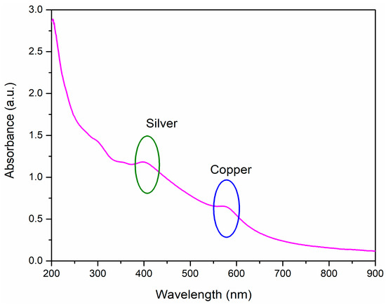 The characterization of Cu-Ag bimetallic NPs was carried out while using UV-Vis spectroscopy. Figure 1 shows the absorbance spectra of copper-silver bimetallic nanostructures. The spectrum shows that the absorption band is shown at 413 nm and 590 nm. Ag NPs exhibit an absorption edge around 400–500 nm, and the Cu NPs exhibit an absorption edge around 500–600 nm, because surface plasmon resonance shows the formation of Cu and Ag NP spectral characteristics. Due to the resonance effect of surface plasmon, noble-metal nanostructures possess collective oscillation of valance electrons and absorb the visible light region [27]. The blue shift in absorbance spectra is expected to the Cu NPs and redshift is expected to the Ag NPs. We found that the obtained results are in good agreement with the previous reports for Cu: Ag ratio [28,29,30]. The location of the precise metal NPs plasmon absorption band determines the shape and size of the NPs. From the above results, the coexistence of Cu and Ag indicates the formation of the bimetallic compound. For further confirmation, XRD, HR-TEM, and EDX elemental and mapping analysis were performed.
