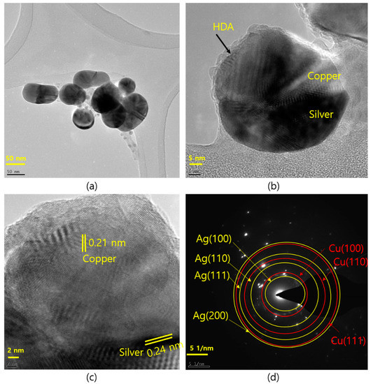 Different magnification HR-TEM images of copper-silver bimetallic nanostructures: (a) 100 nm; (b) representing the silver and copper nanoparticles with hexadecylamine (had) layer; (c) lattice fringes of Cu-Ag nanoparticle; and, (d) SAED pattern of Cu-Ag nanoparticles.