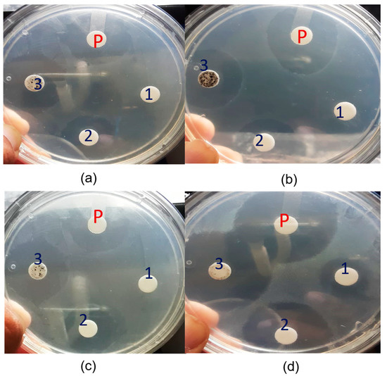 Photographs of Antimicrobial activity of Cu-Ag NPs against different bacteria: (a) Bacillus, (b) Staphylococcus, (c) Klebsiella, and (d) E. coli (P–Penicillin, 1-DMSO, 2- Cu (50 ug), 3- Cu-Ag (100 ug).