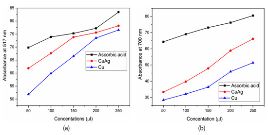 (a). Antioxidant activity Cu-Ag NPs by DPPH assay at a characteristic absorption of 517 nm (b) antioxidant activity Cu-Ag NPs by DPPH assay at a characteristic absorption of 700 nm.
