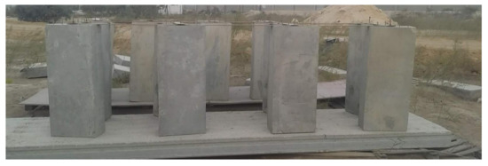 Reinforced concrete blocks (230 mm × 460 mm × 1200 mm) and 75 mm × 150 mm cylinders were made in a ready mix company. Concrete temperatures ranged from 26 to 29 °C. Concrete blocks were covered during the first day of curing using plastic sheets and shaded to prevent plastic and drying shrinkage. They were cured using wet burlap layers that covered each block after demolding for 28 days. Then the blocks were located on a marine-exposure site (Figure 1 and Figure 2). Figure 1 shows the specimens located in the tidal zone with apparent fluctuation of the tides—the frontal row shows plain concrete samples and the back row shows the reinforced blocks. Each reinforced block contained four black steel rebars positioned at different cover depths (12.7, 25.4, 38.1, and 50.8 mm) and connected at the top to stainless steel bars which were needed for measurements. The specimens rested on solid marine-based plywood to avoid sinking and toppling. Specimens in Figure 2 were located about 15 m away from the shoreline, positioned on a solid base and laterally tied to each other using galvanized steel. Chloride profiling and linear polarization, using Gamry Reference 3000 Potentiostat [33], determined the performance of the different mixtures to corrosion activities.