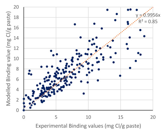 By using the multi-factor approach to express the diffusion coefficient of chloride ion and by incorporating the chloride binding capacity given in Equation (14) into the effective diffusion model of Equation (5), a more accurate expression for chloride transport in concrete can be achieved leading to more realistic prediction of time to corrosion initiation in reinforced concrete. The results produced using the experimental binding values are shown in Section 4.1.
