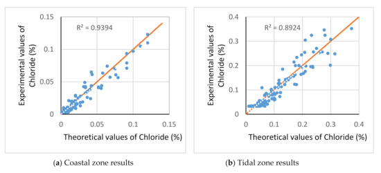 Owing to the complex nature of chloride diffusion models as a result of the dependence of chloride ion diffusion in concrete on many factors, obtaining a perfectly matching result between the numerical models and experimental investigation is not feasible as evident by results obtained in other studies, such as those by Liu et al. [59], Pradelle et al. [24], Riding et al. [25], and Bernal et al. [2]. However, Table 2 shows the statistical analysis conducted to validate the theoretical results against experimental ones. The β-coefficient and R2 (Figure 7) are equal to 1.00 and 0.94 for coastal zone, and 0.89 and 0.89 for tidal zone. This evidenced the accuracy of the model. It can also be seen that the β-coefficient increases with exposure increase, which implies more accuracy is obtained overtime.