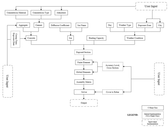The finite element formulation derived in the previous section was developed into programming code using C-Sharp programming language. The developed software is an object-oriented program that utilizes “classes” to achieve the objective. Figure 11 shows the high-level diagram of the classes utilized in the software. The Exposed Cross Section comprised implementation of various other classes including Concrete, Cement, Binding Capacity, Ion, and Weather Condition. Numerical solution code was implemented using the Assembly Matrices of the Finite Elements of the Exposed Concrete Section by taking the Accuracy Level specified by the user (number of nodes in a Cross-Section) into account.