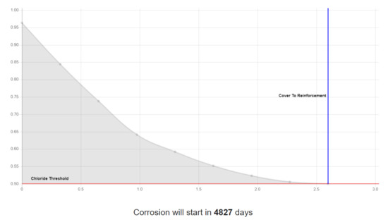 The details collected from the user through the interfaces described in the previous section were utilized for the modeling since all the parameters are embedded in the ionic diffusion model described in the previous section. The output of the calculation is the chloride ion concentration at various depths from the member surface to the top of the reinforcement in the concrete member. From Equation (5), it is obvious that the diffusion model is time dependent, and hence, the calculation will continue in time until a specified chloride threshold is attained at which point the calculation will stop. The chloride concentration at this point in time will then be saved together with the total period (in days) before the chloride threshold is reached (known as corrosion initiation time) in the reinforced concrete member. Chloride ion threshold in reinforced concrete member varies depending on the code of practice being adopted. ACI specifies a chloride threshold of 0.5% by weight of concrete member being analyzed. This value was utilized in the current model to produce results similar to Figure 12.