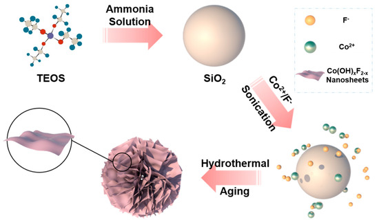 All the chemicals were used without any purification. Figure 1 shows the schematic diagram of the synthesis procedure used for the fabrication of Co(OH)xF2−x nanosheets. SiO2 spheres were synthesized using tetraethyl orthosilicate (TEOS) as described in another report [21]. Co(OH)xF2−x nanosheets were synthesized as follows. CoCl2 (0.3 mM), NH4F (0.3 mM), and urea (0.1 mM) were added into de-ionized (DI) water (30 mL). After stirring for 30 min, the SiO2 spheres (60 mg) were added into the solution, followed by sonication for 30 min. Finally, the solution was transferred to a Teflon-lined steel autoclave with a capacity of 50 mL and heated at 120 °C for 12 h under autogenous pressure. The final solution was then cooled to room temperature. Powder, precipitated from the solution, was collected by filtering and was washed with water and ethanol. The powder was then dried at 80 °C overnight. It went through a subsequent aging process at 120 °C for 10 h for removal of the SiO2 sacrificial template [22]. Chemical analysis using electron dispersive spectroscopy (EDS; EDS attached to the JEOL ARM 200F), nevertheless, disclosed that some SiO2 had remained in the sample after the removal process (see Supplementary Materials Figure S1). For comparison, some materials were synthesized without templates via the same process.