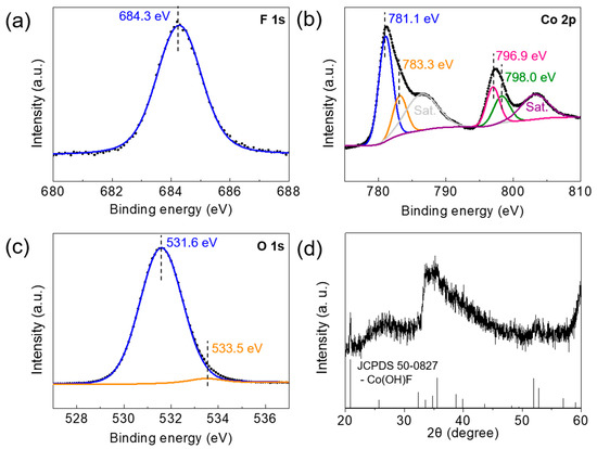 X-ray photoelectron spectroscopy (XPS) spectra of the Co(OH)xF2−x nanosheets ((a) F 1s, (b) Co 2p, and (c) O 1s), and X-ray diffraction (XRD) pattern of the Co(OH)xF2−x nanosheets (d).