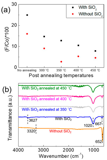 Our FTIR analysis sheds some light on the possible influence of the SiO2 template on retaining fluorine, as shown in Figure 6b. In the FTIR data, the sample synthesized with SiO2 shows a strong peak at 1020 cm−1, corresponding to bonding between Si and F, which does not decline upon annealing at elevated temperatures [30]. In contrast, the no-template sample does not show any peak at 1020 cm−1 but a large one at 650 cm−1, which could be attributed to Co–O bonding [31]. These data indicate that the remnants of the SiO2 templates have possibly helped hold fluorine atoms (prone to evaporation) effectively by providing a strong bond with Si.