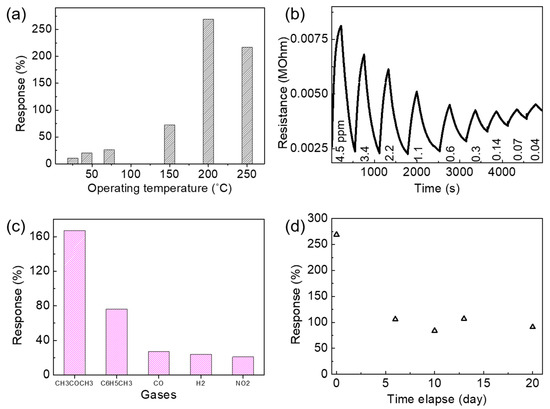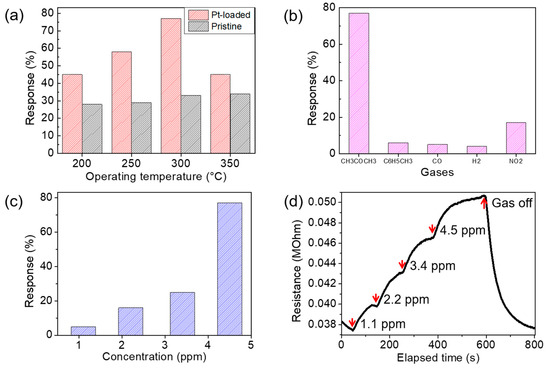 It is well known that noble metal dopants such as Pt, Pd, and Au could enhance gas sensor responses because of their strong catalytic properties [43]. In an effort to recover the deteriorated gas response of the 350 °C sample, we loaded Pt (1 nm) on the sensor and conducted measurements for performance (Figure 10). Figure 10a clearly shows improvements in responses at all working temperatures after loading Pt to the device. The sensor also demonstrated a good selectivity toward 4.5 ppm of acetone gas, compared to 4.5 ppm of other gases such as C6H5CH3, CO, H2, and NO2, as shown in Figure 10b. Figure 10c presents a good sensitivity of the sensor toward acetone at a concentration of 1.1, 2.2, 3.4, and 4.5 ppm. Dynamic sensing characteristics in Figure 10d displays responses of stepwise increase upon the injection of acetone with the concentration increasing from 1.1 to 4.5 ppm, showing a sensitive response at each step and full recovery upon stopping the injection of acetone gas. These data confirm that the Pt loading on the sensor device has enhanced the sensing response, enabling a sensor with a high sensitivity and good stability.