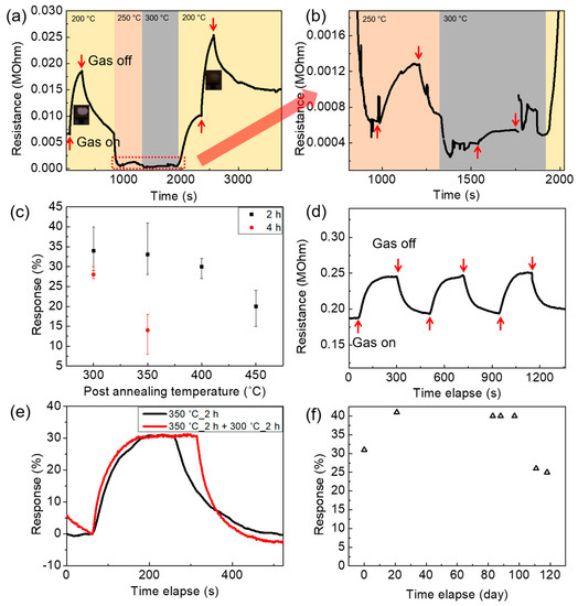 Using the sample annealed at 350 °C for 2 h, we further performed a dynamic test, finding that although the response is low, the sensor works reliably with a full recovery for three successive gas on/off cycles at 300 °C, as shown in Figure 9d. Furthermore, additional annealing at 300 °C for 2 h does not decrease the response, as shown in Figure 9e, suggesting that once the sensing material is annealed at 350 °C, further annealing at a lower temperature would not affect the response much. The result of a long-term stability test shown in Figure 9d also exhibits stable operations with a similar response level for around 3 months. Thus, the annealed sensor at 350 °C shows stable responses although the response level is significantly lower, as compared to the performance of the non-annealed sensor.