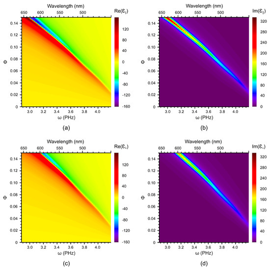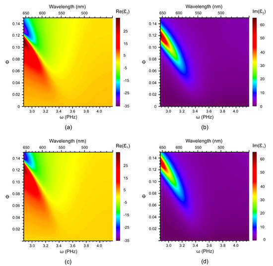 The real and imaginary parts of the longitudinal and the transverse components of the dielectric susceptibility are presented in Figure 2 and Figure 3 as functions of both frequency and the volume fraction of the NPs for nanocomposites based on the nematic host and AuNPs and AgNPs, respectively. In the nanocomposite with gold NPs, the plasmon resonance is clearly visible and its frequency range is rather broad. In contrast, in the same nematic host doped with silver NPs, the plasmon resonance is less pronounced and its frequency range is much smaller.