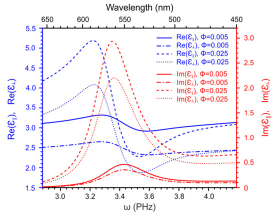 Let us consider now the shift and splitting of the plasmon resonance of the NPs caused by the nematic LC medium. The resonances of the NPs in the nematic medium are determined by the poles of the Equations (18) and (19) which are considered as functions of . Assuming that the LC medium is transparent, one may also assume that the frequency dependence of the dielectric susceptibility of the nanocomposite is determined by that of which is a weakly complex number for according to Equation (16).