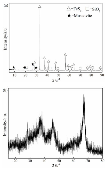 The chemical compositions of the pyrite-rich CTs, calcium carbonate, and alumina are listed in Table 1. The mineral phases of the pyrite-rich CTs, analyzed by X-ray diffraction (XRD), are shown in Figure 1a. According to Table 1 and Figure 1a, the main components of the CTs are pyrite (FeS2), quartz (SiO2) as well as minor muscovite with a total cyanide of 339 mg·kg−1. Analysis of Al2O3 by X-ray diffraction (Figure 1b) reveals that the diffraction peaks of Al2O3 are poor, which is believed to be attributed to the amorphous state of Al2O3. The analytical reagent of calcium carbonate contains 55.91% CaO, whereas that of alumina mainly consists of 94.60% Al2O3 and 5.09% loss on ignition (LOI).