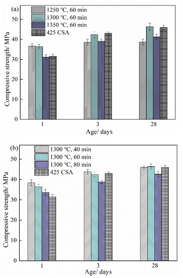 Figure 2a shows that the compressive strength of the cement clinker increases with the increase in curing ages. When the calcination temperature rises from 1250 °C to 1300 °C, the compressive strength of the cement clinker at the same curing ages increases, but decreases dramatically as the temperature rises to 1350 °C. According to L. W. et al. [41], it is believed that C4A3 is not formed completely at low temperature, and the crystal particle of C4A3 is larger at high temperature, leading to the deterioration of the cement clinker’s activity. The compressive strength of the cement clinker calcined at 1300 °C is similar to that of 42.5 CSA. This suggests that the optimal calcination temperature is determined to be 1300 °C and the compressive strength of the cement clinker meets the requirements of 42.5 CSA. In Figure 2b, the compressive strength of the cement clinker increases with the increase in curing ages. With the prolongation of calcination time, the compressive strength of the cement clinker decreases at the curing ages of 1 and 3 days, but remains almost constant first and then decreases at the curing age of 28 days. This suggests that the cement clinker’s activity decreases with the extension of calcination time. The compressive strength of the cement clinker calcined at 1300 °C for 40–60 min meets the requirements of 42.5 CSA. This suggests that the cement clinker meeting the compressive strength requirements of 42.5 CSA can be obtained at 1300 °C for 40–60 min.