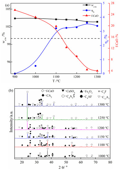 To investigate the behavior of pyrite in CTs during the production of CSA cement clinker, a series of experiments were conducted at 900–1300 °C without retention time. Cyanides were not detected in all samples. According to the results of previous research [42], it is believed that the cyanides in CTs decompose into carbonate, CO2, and N2 during the calcination process. The other results are displayed in Figure 3. As shown in Figure 3a, wc/m is more than 100% in all cases and decreases slightly with increasing temperature, indicating that during the calcination process the pyrite in CTs is oxidized [43]. The increase of ηS with increasing temperature suggests that some of the formed sulfur-containing components decompose at higher temperatures. The mass ratio of f-CaO in the samples decreases with the increase in temperature, indicating that more and more f-CaO is involved in the formation of cement clinker. When the mixture calcined at 1300 °C without retention time, 4% of f-CaO was detected in the sample, indicating that the reaction between f-CaO and the pyrite-rich CTs is still incomplete [6].