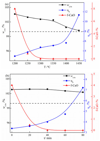 Variation of the mass of the cement clinker to the mixture (wc/m), the decomposition ratio of S for the mixture (ηS), and the mass ratio of free CaO (f-CaO) in the cement clinker versus (a) temperature at 1200–1450 °C for 60 min and (b) calcination time at 1300 °C for 0–80 min.
