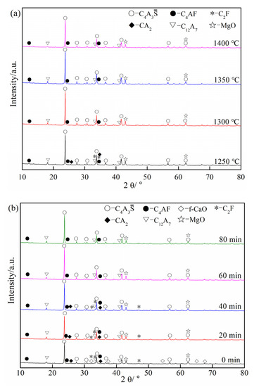 The cement clinker calcined at 1300 °C for 0–80 min was analyzed by XRD. As shown in Figure 5b, C4A3, C4AF, and C12A7 are present in all cement clinker phases. F-CaO is observed at the free retention time of 1300 °C, but disappears when the calcination time exceeds 20 min, indicating that part of f-CaO remains unreacted due to the lack of calcination time, and the reactions involving the consumption of f-CaO are almost complete when the calcination time exceeds 20 min. CA2 and C2F are found in the clinker calcined at 1300 °C for 0–40 min, but disappear when the calcination time is above 40 min. The major phases of the cement clinker calcined at 1300 °C for more than 40 min are C4A3, C4AF, and C12A7. This indicates that the prolongation of calcination time contributes to the decomposition of CA2 and C2F and the formation of the desired mineral phases of C4A3 and C4AF. The mineralogical composition of the cement clinker was analyzed using the Rietveld refinement method with 15.0% MgO internal standard. The PDF and ICSD codes of mineral phases for quantitative analysis are listed in Table 2, and the results are listed in Table 4. The clinker contains 56.7% C4A3, 7.5% C4AF, and 9.3% C12A7, as well as 3.1% C2F, 4.7% CA2, and 3.3% f-CaO when the mixture calcined at 1300 °C without retention time. It implies that the reactions in cement clinker are not complete due to the lack of reaction time. F-CaO was not found at 1300 °C for 20 min, corresponding to the results shown in Figure 4b. This indicates that the reactions involving f-CaO are complete. C2F and CA2 are absent in the cement clinker calcined at 1300 °C for more than 40 min. The content of both C4A3 and C4AF increases significantly with calcination time, whereas that of C12A7 remains quite constant. This suggests that the prolongation of the calcination time promotes the decomposition of CA2 and C2F and the formation of C4A3 and C4AF. Overall, the favorable cement clinker is obtained at 1300 °C for more than 40 min.