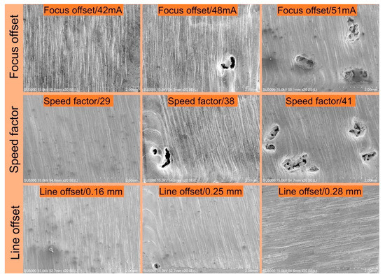 The effect of focus offset, speed factor, and line offset on the surface morphology of EBM Ti-6Al-4V is shown in Figure 3. For samples with a focus offset from 39 to 45 mA, no pores were found at the top surface, so only the sample with a focus offset of 42 mA was shown. When taking a focus offset of 48 or 51 mA, visible pores were found at the top surface.