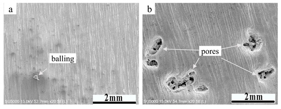 Figure 4 shows two types of defects, namely balling and pores, in EBM Ti-6Al-4V samples. In the process of building the Ti-6Al-4V specimens, a high energy electron beam was applied to the metal powder and the powders were melted to form a molten pool. When the electron beam was applied to the powder for a long time, the molten pool was continuously subjected to the impact and agitation of the electron beam, thus the molten pool produced sputtering. To reduce the free energy of the sputtering melt, spherical droplets were formed and sputtered on the solidified surface. After the droplets were solidified, metal pellets are formed, as shown in Figure 4a. Thoroughly preheating the metal powders can improve the bonding strength of the metal powder particles, to better resist the impact of an electron beam, and reduce or even eliminate the spheroidization phenomenon.
