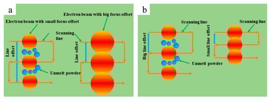 Schematic diagram of the relationship between line offset and electron beam spot: (a) line offset is the same but spot diameter is different; (b) spot diameter is the same but line offset is different.