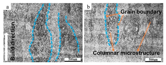 Figure 9 shows the columnar crystal morphology of the samples with the lowest and highest yield strength. It can be seen that the columnar crystals grow along the building direction (the direction indicated by the white arrow), which is a typical feature of electron beam melting of metal materials. Bruno et al. [14,15,16] reported the existence of columnar crystals. Their shape is irregular, and the grain boundaries are relatively fuzzy, which are marked with cyan dot-dash lines in Figure 9a,b.