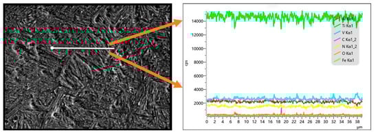 To study whether there is element segregation in grain boundaries, a line was drawn across the grain boundary, and the energy spectrum analysis was performed on the specimens with a line offset of 0.28 mm. Figure 12 shows the energy dispersion spectrum (EDS) line scan results of samples with a line offset of 0.28 mm. It can be seen that various elements are uniformly distributed throughout the scan line, and the main elements are still Ti, Al, V, C, N, and O, and that there is no element segregation in grain boundaries.