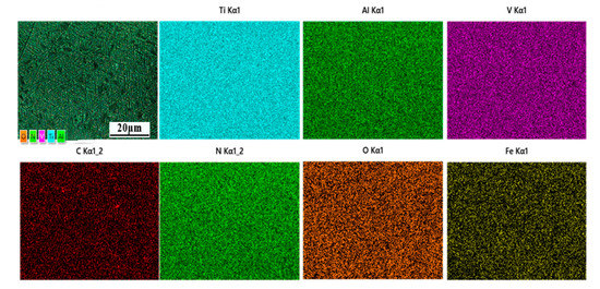 To investigate the distribution of elements on the entire surface, an EDS area scan was performed on the sample with a line offset of 0.28 mm, and the result is shown in Figure 13. It can be seen from Figure 13 that the major chemical elements on the entire scanning area are still Ti, Al, V, C, N, O, as well as a trace amount of Fe, which is consistent with the powder chemical composition test results. The elements are evenly distributed on the entire scanning area, no elements segregation or aggregation is found, which indicates that there is no composition segregation in the electron beam melting of Ti-6Al-4V titanium alloy.