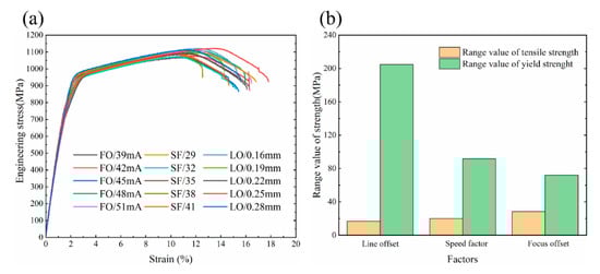 The tensile results of all specimens are statistically analyzed to determine the factor that has the greatest impact on the ambient temperature strength of Ti-6Al-4V alloy among the three factors. It can be seen from Figure 14b that the variation of line offset, speed factor as well as focus offset have little effect on tensile strength, and the change in tensile strength is less than 30 MPa. Among the three factors, line offset has the greatest influence on the yield strength. When the line offset is increased from 0.16 to 0.28 mm, the yield strength of the sample is increased by 200 MPa.