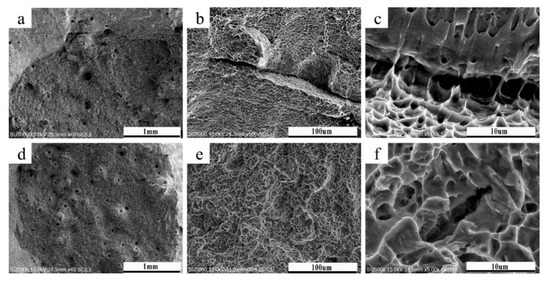 The macroscopic morphology of the fracture surface of the Ti-6Al-4V samples formed at different line offset: (a–c) samples with a line offset of 0.16 mm; (d–f) samples with a line offset of 0.28 mm.