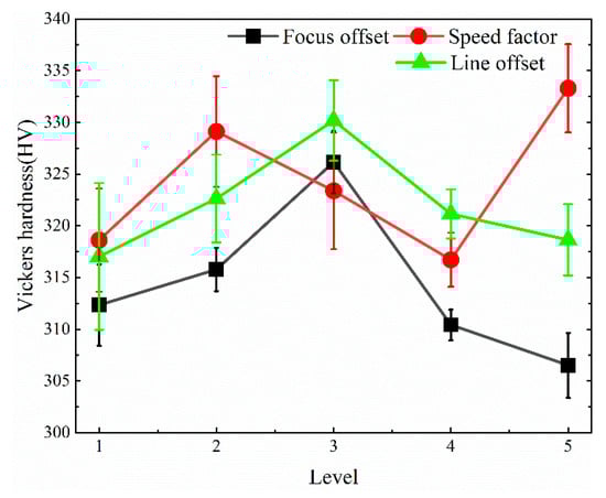 As for the speed factor, the Vickers hardness shows a tendency to fluctuate as it increases from level 1 to level 5. Intuitively, the maximum value of Vickers hardness is obtained at level 5 for speed factor, however, this may be an outlier. Generally speaking, the Vickers hardness varies in the range of 300 HV–340 HV, and the variation range is of Vickers hardness is relatively small.