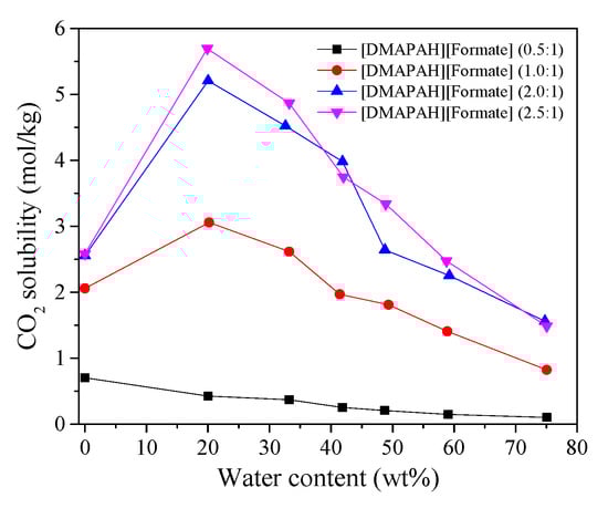 Figure 1. Effects of water on CO2 solubility in [DMAPAH][Formate]. The values in Figure 1 are cited from Vijayaraghavan et al. [30]. Copyright 2018 Elsevier.
