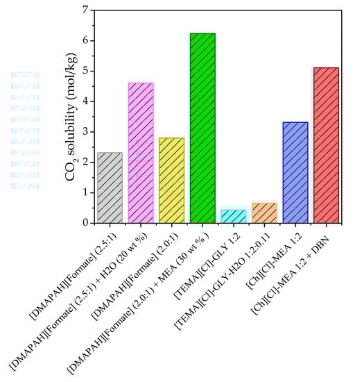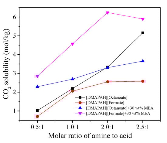 Figure 2. Effects of MEA on CO2 solubilities in [DMAPAH][Formate] and [DMAPAH][Octanoate] [30]. Copyright 2018 Elsevier.