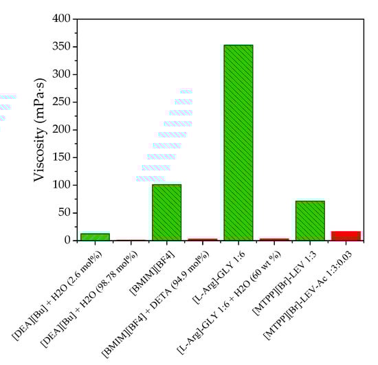As shown in Table 3, the viscosities of the [N1111][Lys] + DMEE and [BMIM][BF4] + DETA hybrid solvents increased with increasing the content of ILs and decreasing temperature [51,53]. Based on the study of Meng et al. [51], the viscosity of [N1111][Lys] + DMEE significantly decreased when the IL is <60 wt % compared to the pure [N1111][Lys].